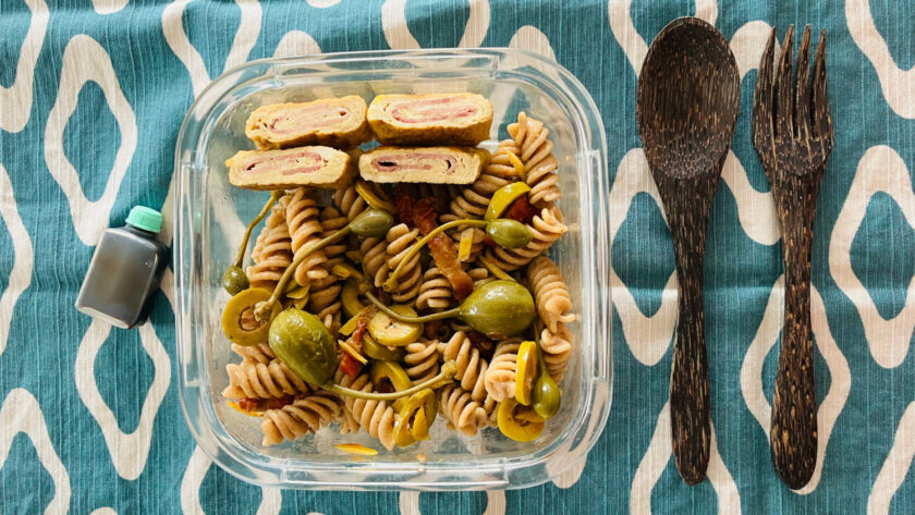 Pour changer un peu des classiques bento japonais qui contiennent souvent du riz, j’ai composé celui-ci sur une base de pâtes. J’ai fait une salade de pâtes aux olives, tomates confites, grosses câpres avec un filet d’huile d’olive. Je l’ai accompagnée de tamagoyaki (omelette japonaise) au jambon pour les protéines. Au moment de déguster, versez sur la salade de pâtes une petite bouteille contenant un mélange de vinaigre balsamique et sauce soja et régalez-vous d’un repas fait maison avec amour à l’extérieur !