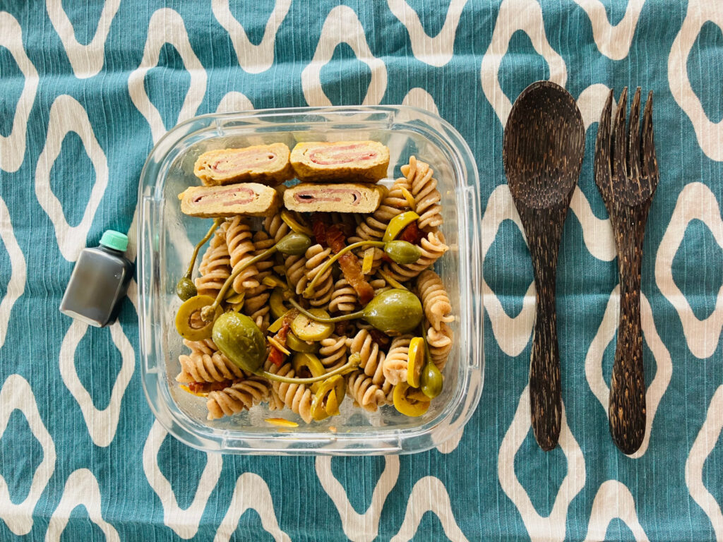 Pour changer un peu des classiques bento japonais qui contiennent souvent du riz, j’ai composé celui-ci sur une base de pâtes. J’ai fait une salade de pâtes aux olives, tomates confites, grosses câpres avec un filet d’huile d’olive. Je l’ai accompagnée de tamagoyaki (omelette japonaise) au jambon pour les protéines. Au moment de déguster, versez sur la salade de pâtes une petite bouteille contenant un mélange de vinaigre balsamique et sauce soja et régalez-vous d’un repas fait maison avec amour à l’extérieur !