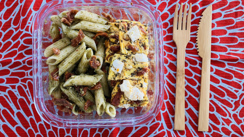 Aujourd’hui, c’est journée bento pour fêter l’arrivée imminente du printemps ! Avec les beaux jours, j’ai envie de saveurs méditerranéennes. J’ai alors eu l’idée d’associer des pâtes au pesto de basilic et une frittata qui sont tous les deux originaires d’Italie avec le chorizo espagnol et la feta grecque. Voilà un heureux mélange méditerranéen qui ravit les papilles. Quelques zestes de citron pour donner un peu de peps à ce bento et vous voilà avec un plat ensoleillé à emporter partout avec vous !