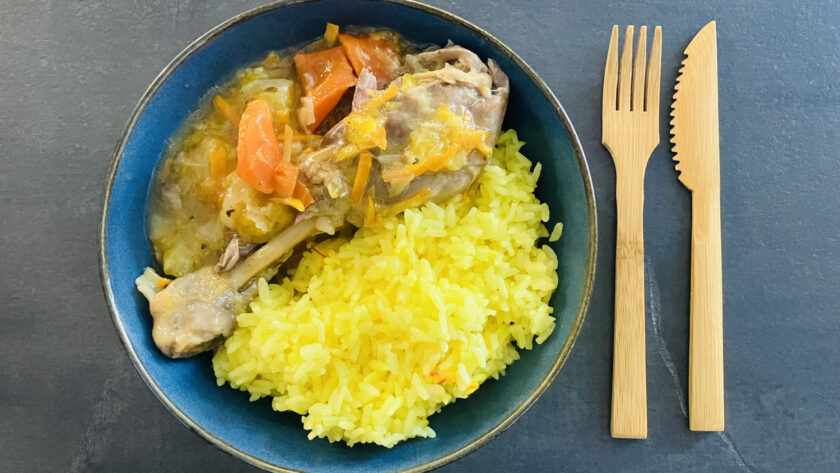 Et que dire de sa sauce à l’orange, au vin blanc et aux petits légumes confits à point ? Mon mari m’en redemande déjà ! Accompagnez-le de riz au safran et vous obtiendrez l’accord parfait. J’espère que vous aimerez ce plat autant que nous 🙂 !