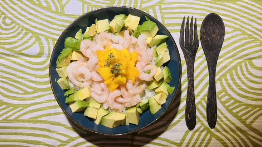 J’aime beaucoup mélanger les crevettes au goût iodé avec l’avocat qui est un fruit généreux et tout doux. J’ai décidé de les accompagner d’une mangue sauvage. Les mangues sauvages sont petites mais puissantes ! Leur richesse aromatique est incroyable. Je vous promets qu’elles en valent le détour ! Je dépose le tout sur un lit de riz à sushi vinaigré.