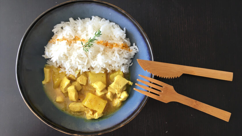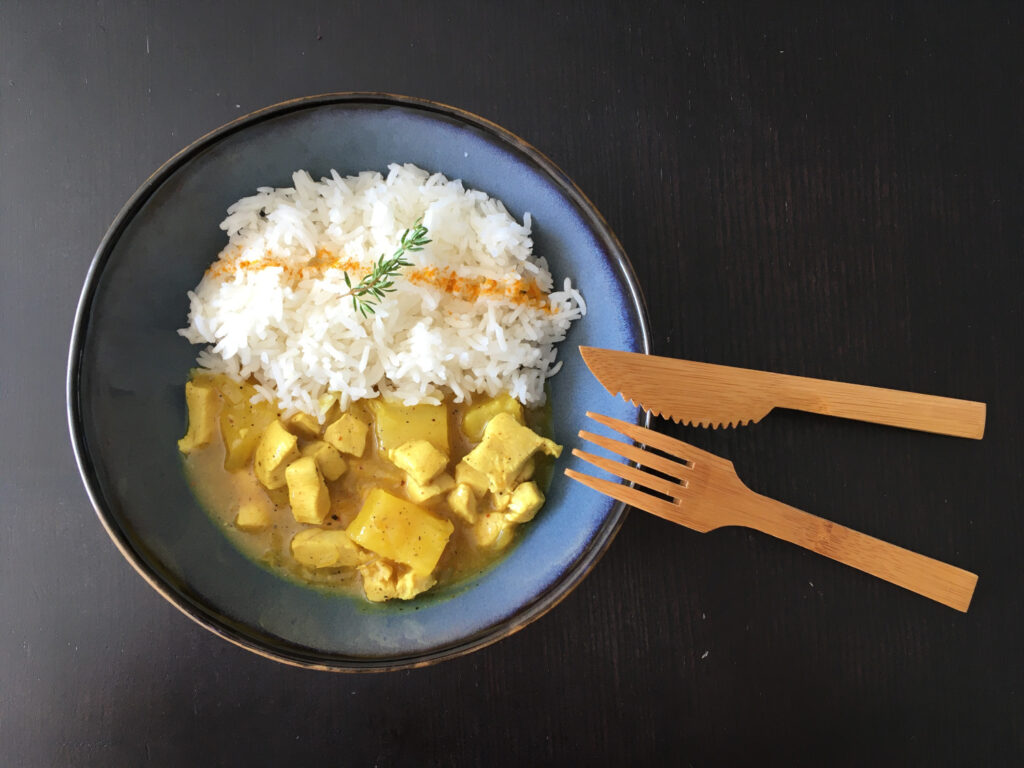 Aujourd’hui, je vous emmène en pays chaud et ensoleillé avec cette nouvelle recette. Elle allie le poulet avec la douceur de la vanille et de la noix de coco, le citronné du poivre sansho (qui n’est pas piquant), avec le sucré de l’ananas. Ces ingrédients contrastent avec le goût épicé du curry. Je trouve le mélange très intéressant. L’ananas et le curcuma présent dans la poudre de curry apportent une jolie couleur ensoleillée à la sauce. De surcroît, la recette est très facile à faire chez vous. Accompagnez-la simplement avec du riz blanc qui laissera tous les parfums s’exprimer !